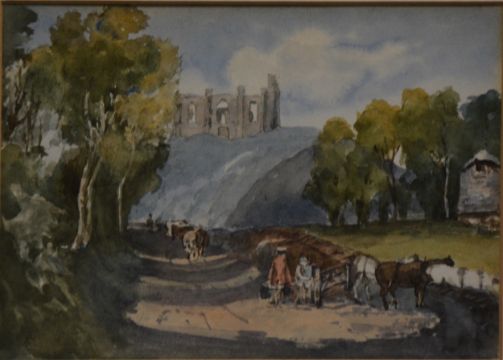 English School, Landscape with figures and Abbey ruins, watercolour, unsigned, 14x20cm. Good condition, modern frame, mounted under glass.