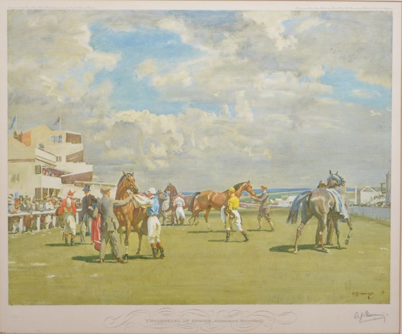 Alfred J Munnings, Unsaddling at Epsom, colour print, signed, published by Frost & Reed, 45x54cm. Good condition, the margins slightly discoloured on all edges, the mount discoloured and numerous insects under the glass, colour fair, original frame with original Frost & Reed labels on the back.
