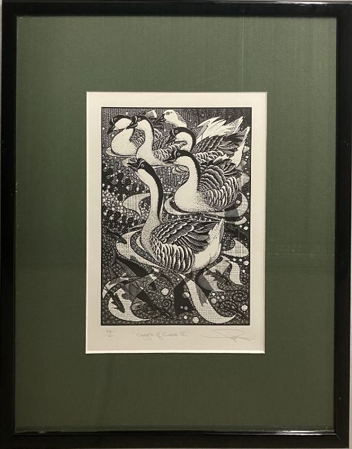 Colin See-Paynton, Quietude of Swans, 33/150, 20x15cm, Ring Ousel, 14/100, 15x10cm, Smew, Artists Proof, 14x10cm, Gaggle of Geese II, 34/150, 20x15cm, four signed prints. All in good condition, mounted under glass in gloss black frames.