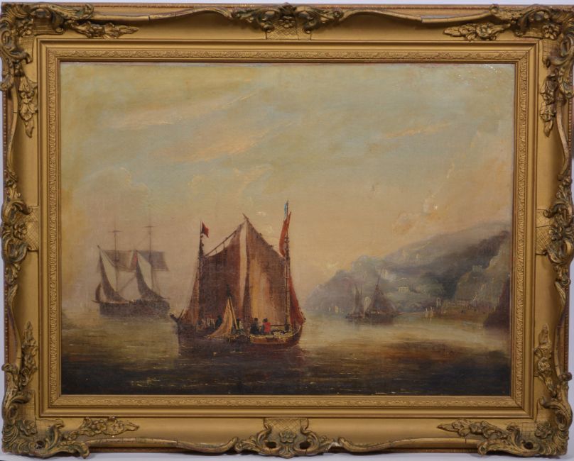 Follower of Jan van de Cappelle, Shipping off the coast, oil on relined canvas, 44x59cm. Label on the back states this as a work by Andrew Hunt, substantial old repairs, overpainting and restoration, indistinctly signed, old gilt frame.