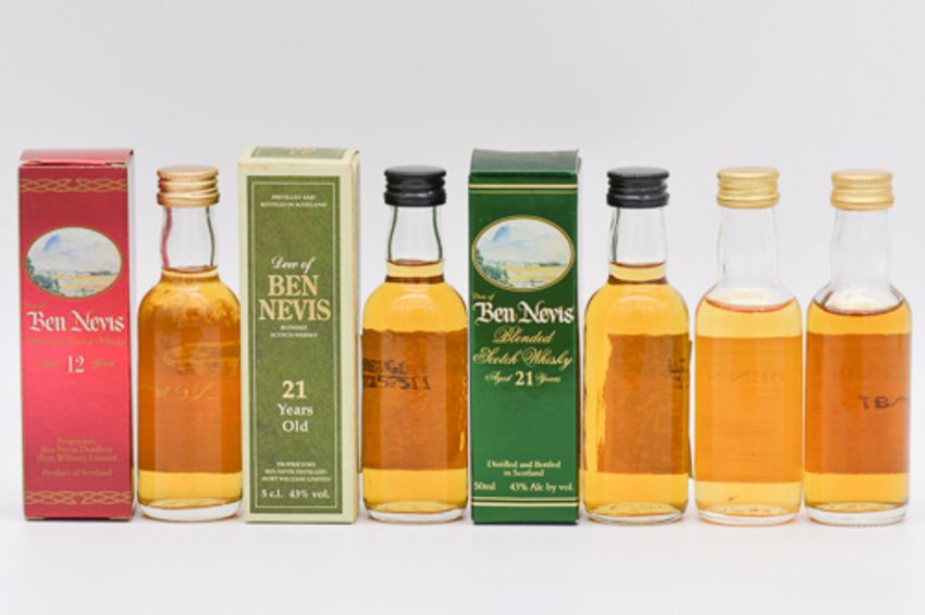 Dew of Ben Nevis, five bottlings of miniature blended whisky inclduing:
