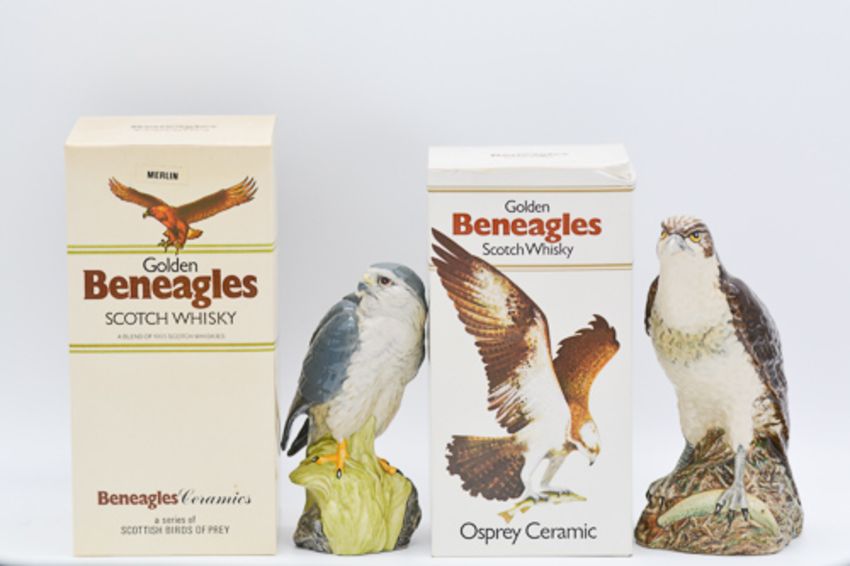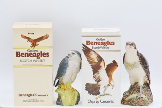Beneagles Merlin and Osprey, two ceramic decanters, containing Whyte & Mackay's blended Scotch whisky, Merlin 20cl, 40%, Osprey 378ml, 70º proof, both boxed.
