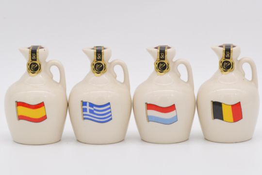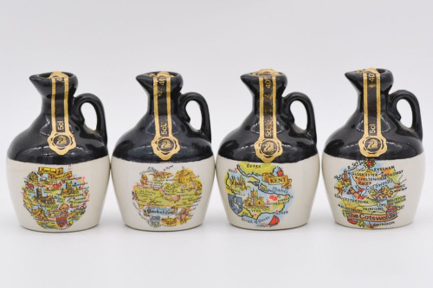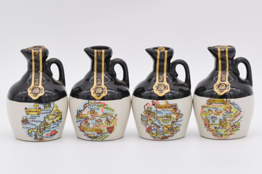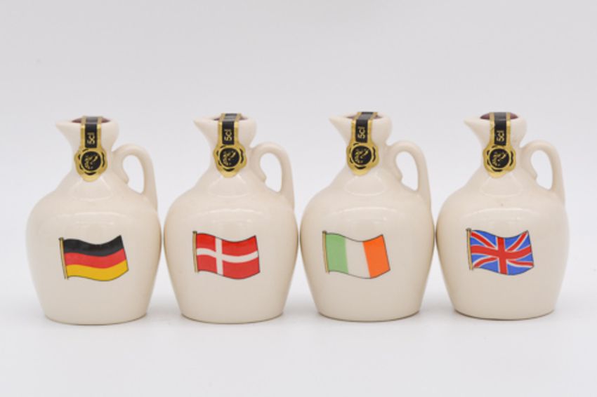 Twenty four assorted Rutherford's white ceramic decanters, blended Scotch whisky, county maps series on stoneware decanters, and country flags on all-white decanters, each 5cl, 40%.