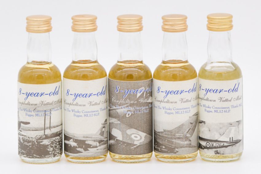 The Whisky Connoisseur - the complete Flying Machines miniatures series, 8 year old Campbeltown vatted malt whisky, 15 bottles, each 5cl, 40%.