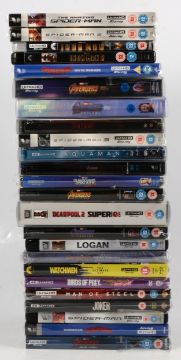 Ultra HD 4K blu-ray selection, twenty-four Marvel and DC films, including Avengers; Spider-man; Deadpool; Birds of Prey; Aquaman; Iron Man; Venom; and others, some are Steelbook and some are sealed.