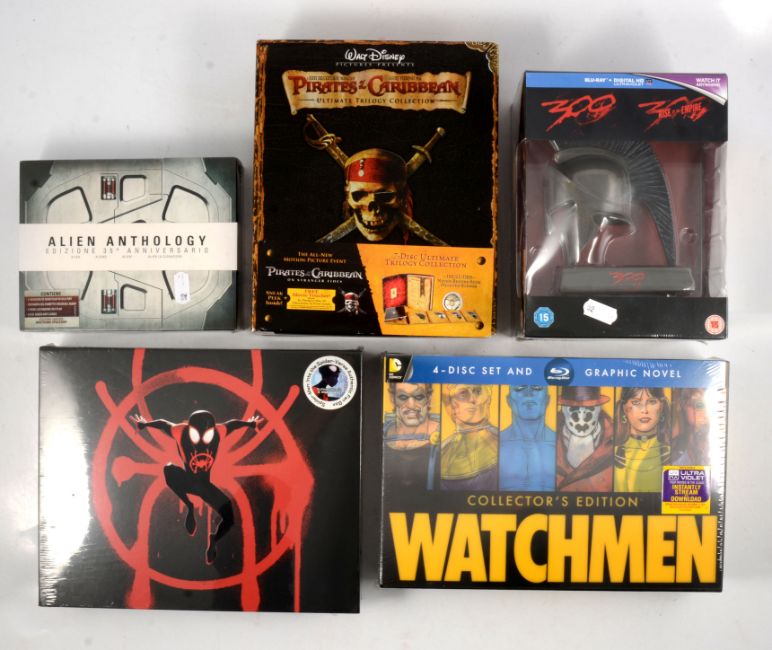 Blu-ray film box sets, five including Blufans Exclusive Spider-Man - Into the Spider-Verse; Watchmen Collector's Edition; Alien Anthology, 35 year anniversary; 300 Empire of the Sun, Ultra HD with helmet statue; Pirates of the Caribbean Ultimate Trilogy Collection, all but Pirates are sealed.