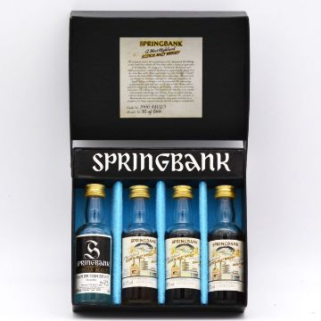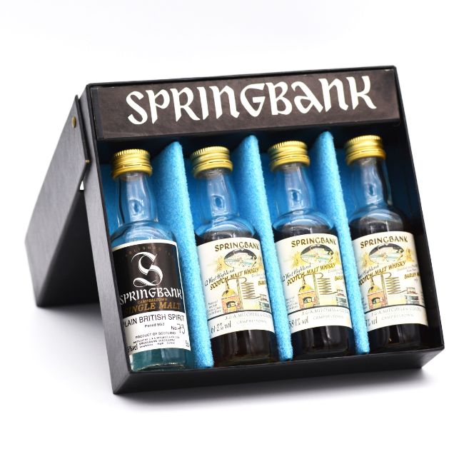 Springbank 1966, Old Local Barley, a rare presentation gift set containing four miniatures, three containing 24 year old pure barley malt, bottled in 1990, from casks 441/2/3,61.2%, 58.1%, 60.7%, numbered 73, the fourth labelled as 'Plain British Spirit' (dated 90/2), 61.5%, in presentation box.