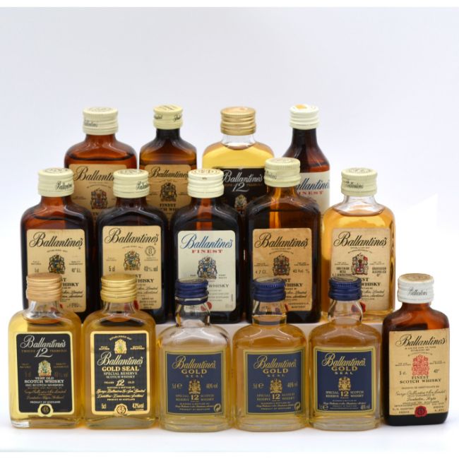 Ballantine's - an extensive collection of the Ballantine's brand whisky miniatures - Finest, Gold Label 12 year old, 17 year old, 18 year old - with label variations from the 1950s-early 2000s, as well as label variations for foreign imports, totalling 124 bottles, offered with a folder catalogue detailing each bottle and labels.