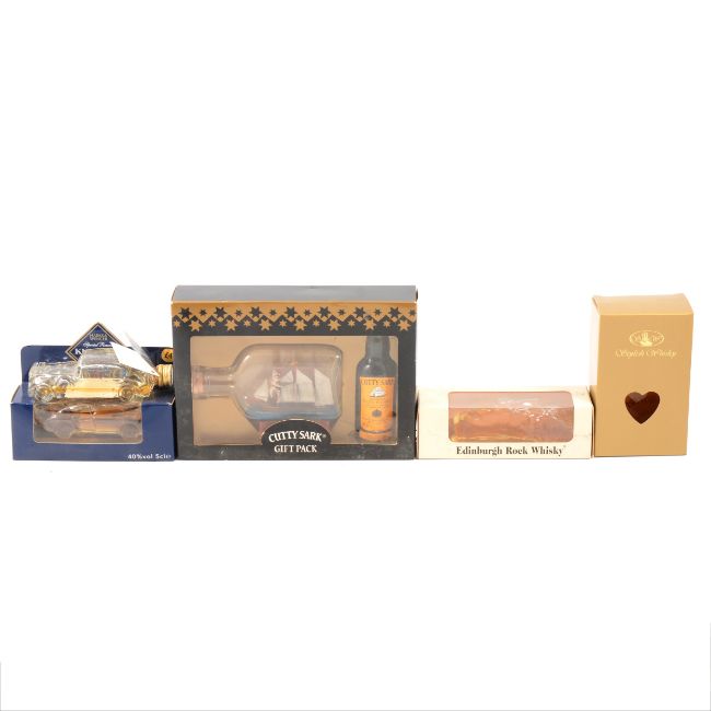 Two Edinburgh Rock whisky novelty glass bottles, one in wooden case