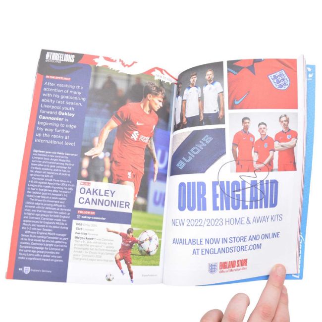 England Senior and U21 signed matchday programme, vs Germany Senior and U21 26/09/2022 and 27/09/2022 Wembley ans Bramwell Lane, signed by James Trafford, Levi Colwill, Luke Thomas, Tommy Doyle, Harvey Elliott, Connor Gallagher, James Gardner, James McAtee, Tyler Morton, Oliver Skipp, Rhian Brewster, Angel Gomes, and Anthony Gordon