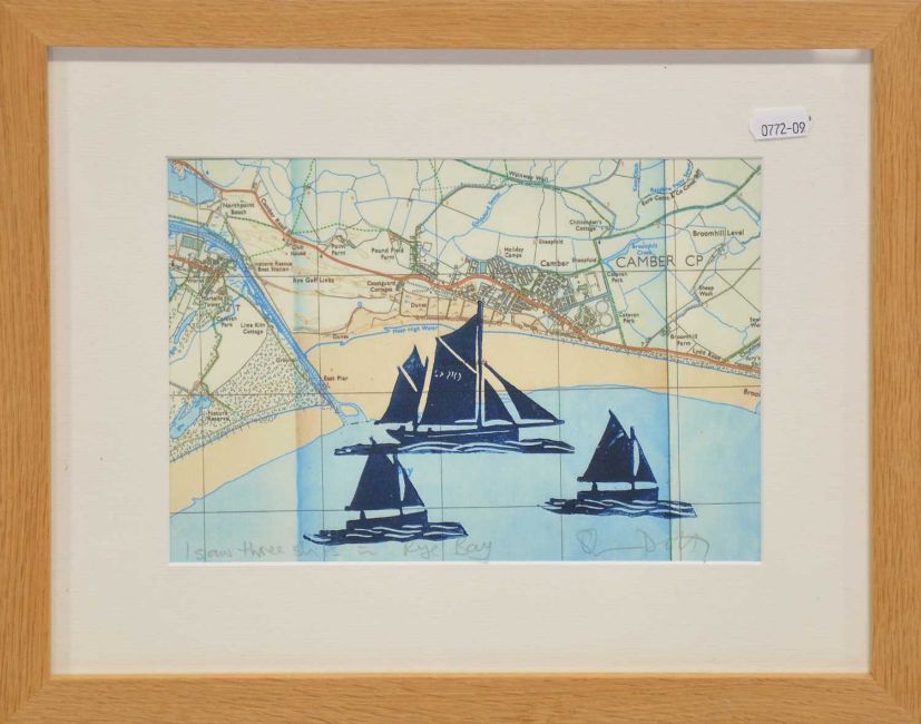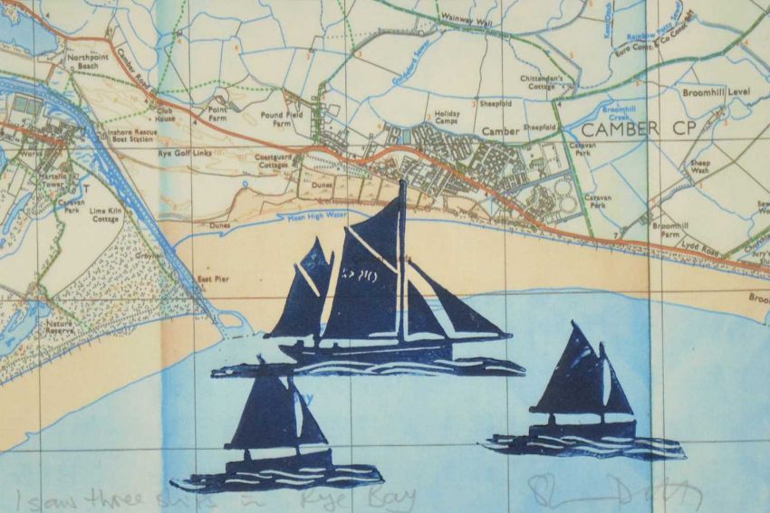 Steve Duffy, I saw Three Ships in Rye Bay, linocut on old chart, 17x24.5cm;