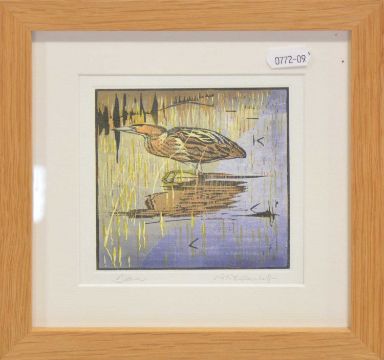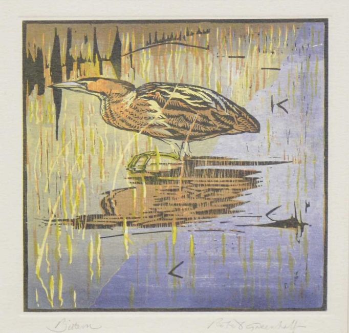 Robert Greenhalf, Bittern, linocut, 11.5x11.5cm;