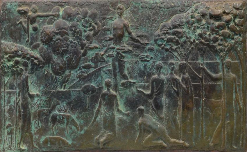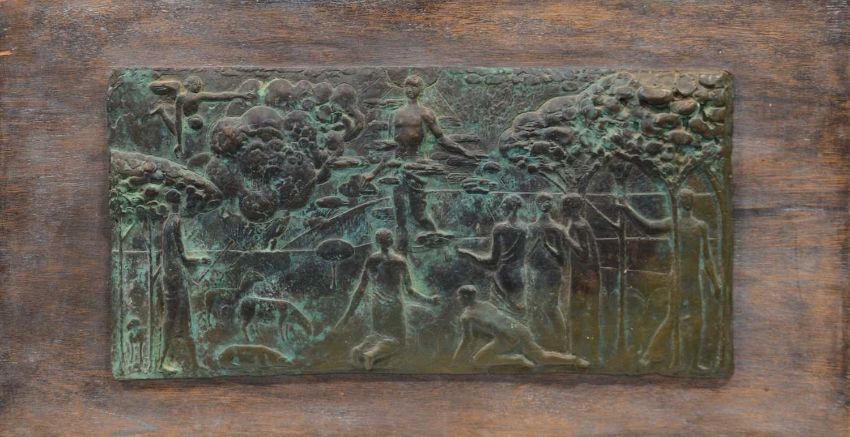 unsigned, cast bronze panel on wooden mount,