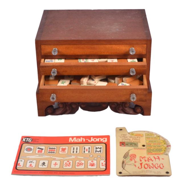 A Mahjong set, in wooden case, one-hundred and forty-eight tiles including eight blanks, with Chad Valley instructions and KTG Mah-Jong booklet.