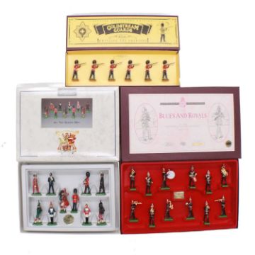 Britains lead figures, three including ref. 8800 Coldstream Guards; ref. 8007 'All the Queen's Men'; ref. 5293 'The Blues and Royals', all boxed