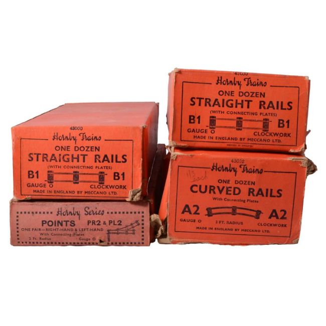 Six various O gauge scale model railway rolling stock including Marklin 0-4-0 luggage coach with sliding doors no. 17320; Marklin low-sided Bogie wagon; Bowman Models LNER Brake Van; Hornby LMS 10T Goods brake van; Brimtoy "teak" passenger coach; and a Hornby LMS Furniture Removal Service container; together with four boxes of Hornby O gauge track.