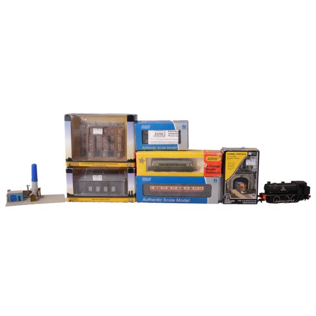 Quantity of N gauge model railways, including two raham Farish boxed buildings, two Dapol engines and one coach, Hornby Minitrix engine, quantity of rolling stock and coaches (not boxed), scenery and kits, track.