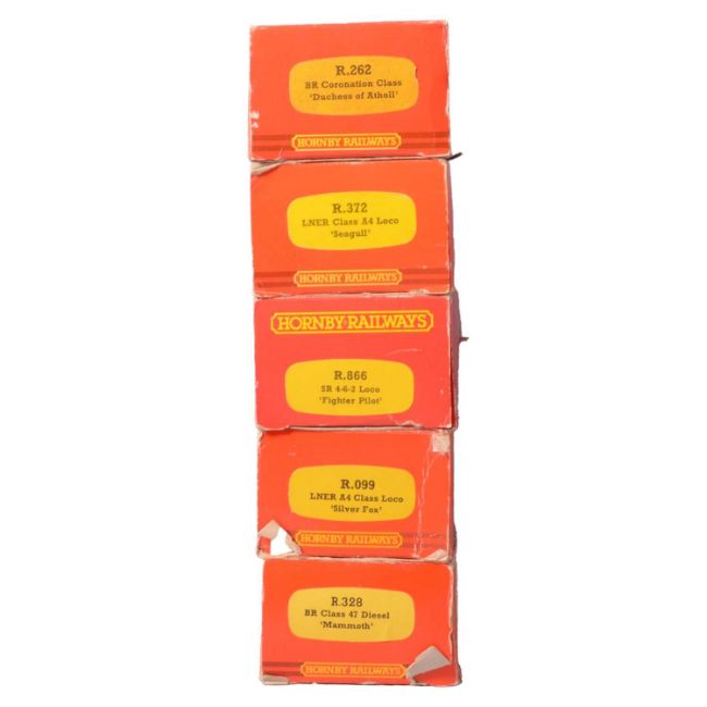 Five Hornby OO gauge locomotives, including R.328 BR Class 47 diesel Mammoth, R.099 LNER A4 Class Silver Fox, R.866 SR 4-6-2 Fighter Pilot, R.372 LNER Class A4 Seagull, R.262 BR Coronation Class Duchess of Atholl, all boxed.
