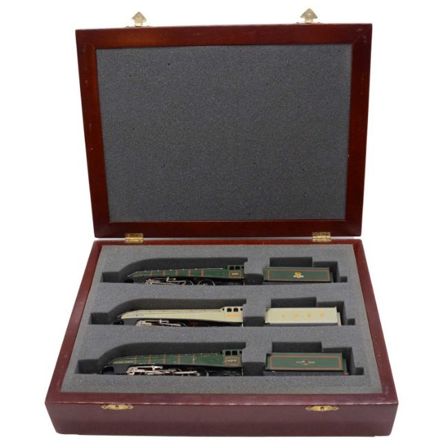 Hornby OO gauge model railway three train set, Silver King, Sparrow Hawk and Golden Fleece, mahogany case.