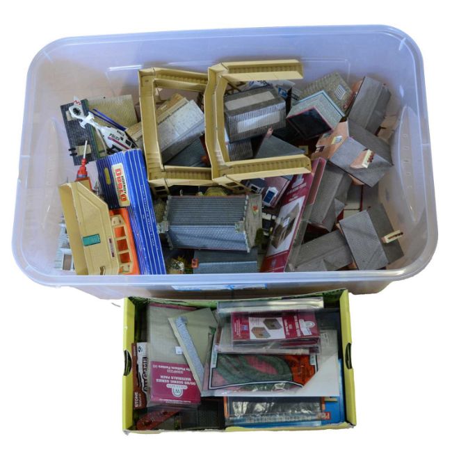 Two boxes of OO gauge model railway buildings and trackside accessories, including 2x Hornby Dublo Footbridges, Dublo Station 'Derby', numerous Hornby Hobbies Limited 'Skaledale' buildings, all loose, Wills Kits Scenic Series packs, etc.