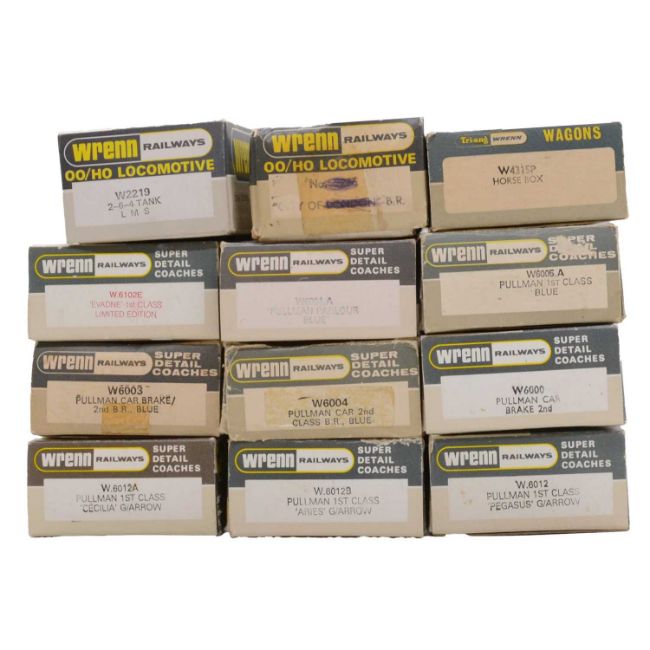 Wrenn OO/HO gauge model railway, two locomotives, GWR incorrect box, City of Sheffield incorrect box, nine coaches and a horse box, all boxed.