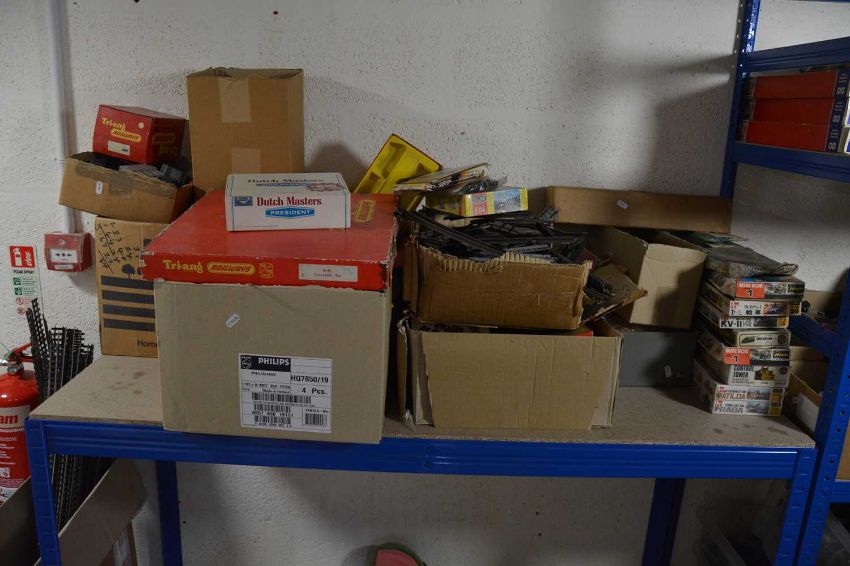 Large quantity of model railway buildings, including Triang, some boxed, three Hornby Station over roofs, boxed, track including Triang OO/HO turntable, boxed, Airfix, Hasegawa, Heljan and other plastic kits, many boxed, etc.