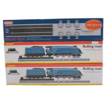 Three Hornby OO gauge model railway rolling roads, including R8023 live steam rolling road, and two R8211 rolling roads, all boxed.